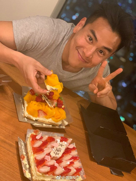 彭于晏吃蛋糕庆生 摆出V字手势心情超好