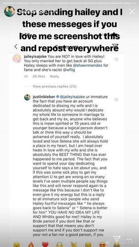 3月26日,比伯在社交网站发文,首次回应对于某些粉丝对于海莉的恶评,维护自己的妻子。比伯在文中提到:“海莉是他最爱的人,不要给我和海莉发这样了,如果爱他就转发出去,支持海莉就是支持比伯我! ”