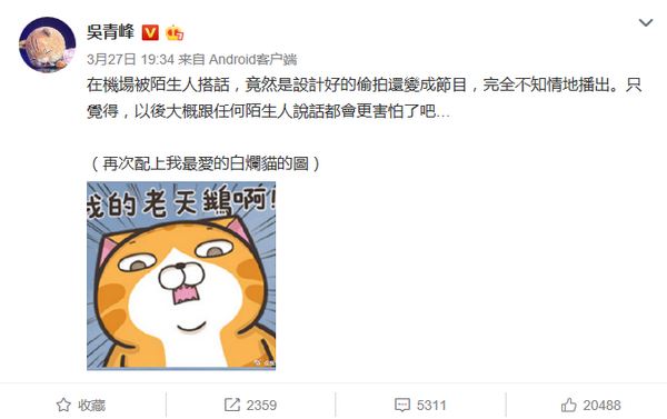 27日晚,吴青峰发文回应了被某测试节目偷拍一事,表示“在机场被陌生人搭话,竟然是设计好的偷拍还变成节目,完全不知情的播出,只觉得,以后大概跟任何陌生人说话都会更害怕了吧…”还附上了一张带有“我的老天鹅啊”字样图片。