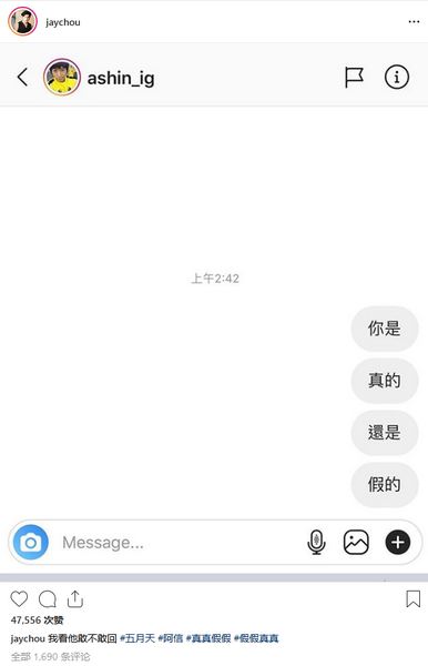 3月28日,周杰伦在社交网站上晒出与歌手阿信的聊天记录,询问阿信是“真的还是假的”。