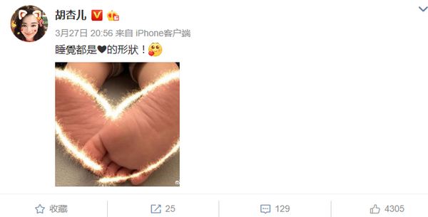 27日晚,胡杏儿晒出儿子睡觉状态下的小脚丫,并配文“睡觉都是心的形状”。照片中,Brendan的脚丫叠在一起,看上去仿佛就是在比心。