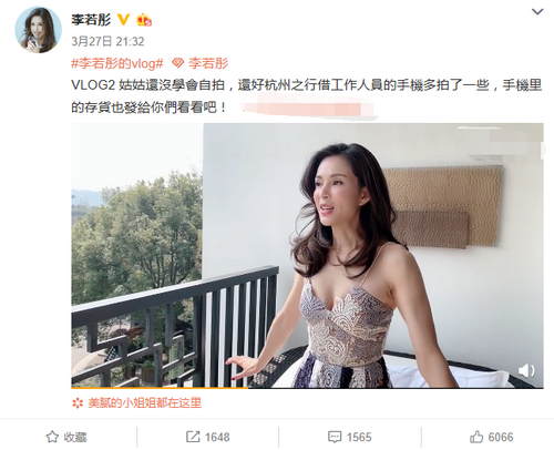 3月27日晚,李若彤在网上更新第二期VLOG并配文道:“姑姑还没学会自拍,还好杭州之行借工作人员的手机多拍了一些”。视频中李若彤身穿低胸吊带裙看上去十分性感,李若彤也在评论中害