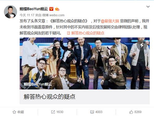 《大脑》导师鲍云发文再回应 否认违约称不再合作