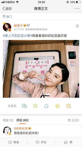 昨日,阚清子在社交平台上发布一条动态,称:“让我看看谁的彩虹屁最厉害”。并配上一张单手比耶的自拍。照片中,她身穿粉色外套温柔甜美,头发上别着一只银色发夹俏皮可爱。引来网友一阵热评,纷纷开始在评论里发起了花式彩虹屁:“阚阿姨,你是我心里最美的那朵花。”“这是什么绝世美少女,万年一遇的颜啊!”“是小仙女没错了!”