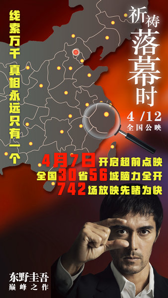 影片在日本公映时曾连续三周拿下票房冠军,被媒体盛赞为“东野圭吾推理宇宙巅峰之作”、“日本年度悬疑佳作”,国内豆瓣评分更是高达8.0,是近几年来最为成功东野圭吾的影改作品。据悉,由日本东京广播电视台出品,中国电影集团公司进口,中国电影股份有限公司发行,东野圭吾同名小说改编,阿部宽与松岛菜菜子联袂主演的《祈祷落幕时》将于4月12日正式公映,届时将为国内影迷带来一场叹为观止的悬疑推理盛宴。