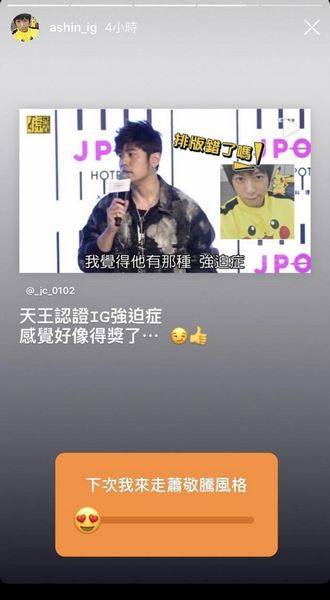 阿信7日在大阪开唱,趁空档在IG发布相关新闻片段截图,笑称自己能被天王认证有IG强迫症,有种得奖的感觉,并且透过问答菜单示:“下次我来走萧敬腾风格。”不久后老萧转发并在限时动态发文:“阿信哥,我的路真的不好走,你走你的独木桥,我走我的市民大道。”