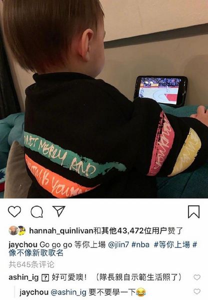 8日凌晨,周杰伦在社交软件上晒出一张儿子的近照,照片中罗密欧穿着黑色上衣站在沙发上,用手机全神贯注地看着篮球比赛,一头棕黄色的头发毛茸茸的,十分可爱。爸爸周杰伦配文“等你上场”