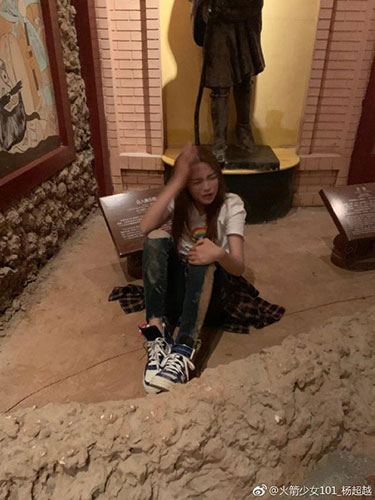 4月9日,杨超越在微博曝光摔跤的照片,照片中杨超越坐在地上,用手揉头,表情痛苦,身上全是泥。还配文提醒室内不要戴墨镜。稍后,杨超越更新微博,上传摔跤前的视频,并写道:“下一秒会发生什么谁也