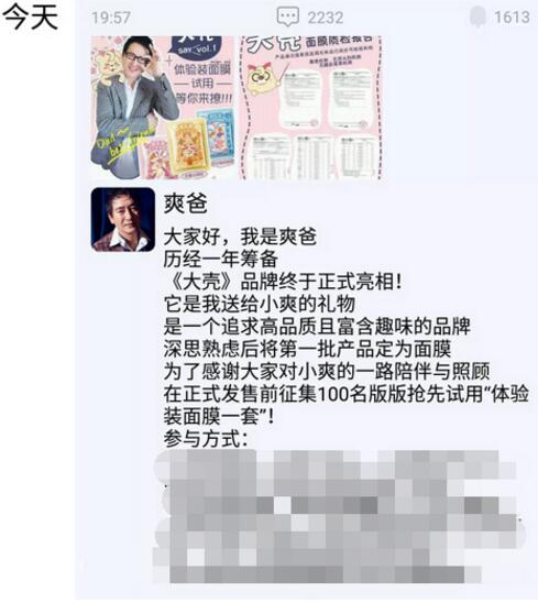 从晒出的照片可见,面膜以粉丝为主,不仅有相关的使用说明等,爽爸的宣传照也很显眼。文字中,爽爸难掩品牌正式与大家见面的喜悦之情,“它是我送给小爽的礼物,是一个追求高品质且富含趣味的品牌。深思熟虑后的第一批产品定为面膜,为了感谢大家对小爽的一路陪伴与照顾。”
