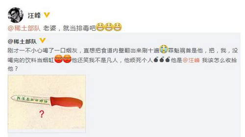 4月12日下午,章子怡发文称:“刚才一不小心喝了一口烟灰,直想把食道内壁翻出来刷十遍。”,还揭露了“罪魁祸首”就是老公汪峰“他,把,我,没喝完的饮料当烟缸。”,并向粉丝询问道“?我该怎么收拾他? ”
