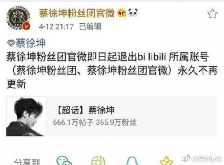 4月12日,蔡徐坤方发布致B站律师告知函,称B站上存大量对蔡徐坤表演进行恶意剪辑、诽谤的内容,要求立即删除相关侵权内容并断开侵权链接。随后,蔡徐坤粉丝团官微发微博宣布退出B站,永不再更新。目前,该条微