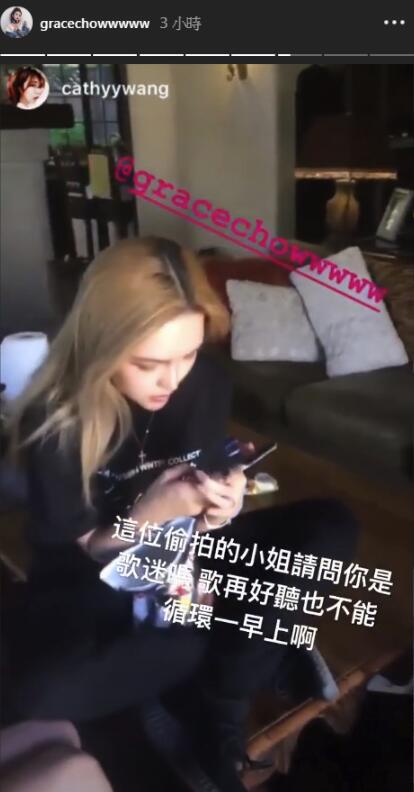 恺恺12日公开一则限时动态,可以听见整个屋内回想着罗志祥的歌曲《NO JOKE》,周扬青则是非常习惯的样子坐着紧盯手机,似乎正在研究资料要讨论事情,但嘴角时不时也勾起笑容,虽然看起来无心,但其实还是有在听男友歌曲并享受其中。周扬青发现被恺恺偷拍的时候,也忍不住转发限时动态还顺便放一个大闪:“这位偷拍的小姐请问你是歌迷吗?歌再好听也不能循环一早上啊!”《NO JOKE》这首歌其实已经是去年的歌曲,一个小小的转发动作除了晒恩爱还能再帮男友打广告,真的一举两得,另外,她还曾经出过以该“NO JOKE”为主题设计的红色和黑色帽T。