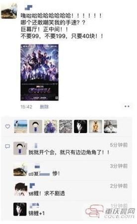前天晚上,何爽的朋友代先生给他发来微信,“那两张能转给我吗?我一张给你加50元!”代先生也是《复仇者联盟》的忠实影迷,前天下午,等他反应过来要抢票时,各大影院的IMAX厅和巨幕厅好位置都已经售空,“我住在解放碑,想去南岸偏一点的地方看,都没位置了。”至于其他一般的影厅,代先生又觉得声光效果不好,“看首映,又是一代英雄的大结局,肯定想要最好的观影体验。”