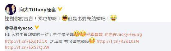 4月14日,网友晒出偶遇向佐郭碧婷的视频,并配文称:“F1人群中最甜蜜的一对!早生贵子哦!”15日,向太转发该微博,并配文调侃:“谢谢你的吉言,我也想啊!但是也要先结婚吧!”