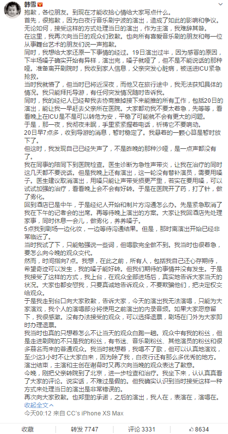 韩雪就假唱事件道歉:父亲突发心脏病 一夜未眠后失声
