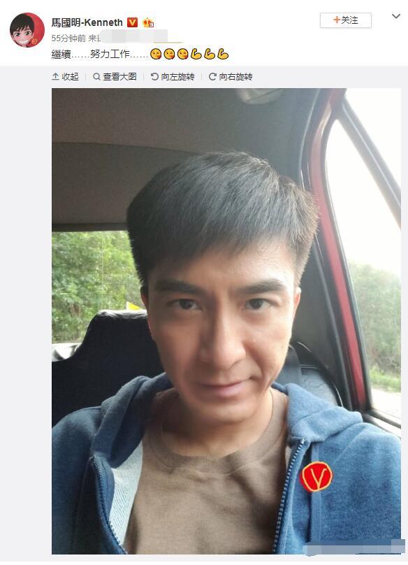 4月22日晚,马国明晒自拍照,并发文称:“继续……努力工作……”照片中,马国明坐在车里,身穿蓝色卫衣,对镜耍酷,看上去心