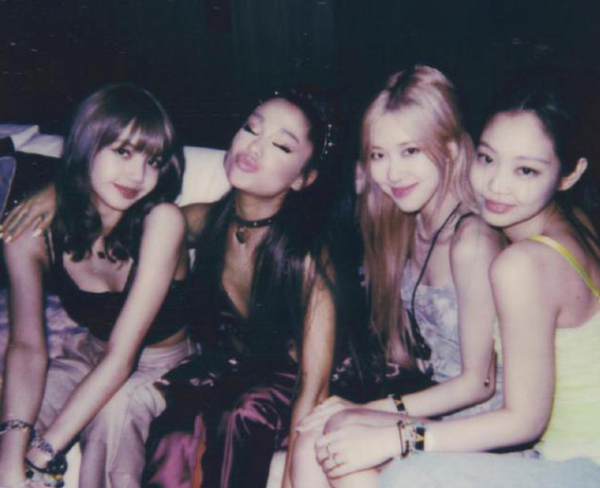 阿里亚娜格兰德在个人社交平台晒出与韩国女团BLACKPINK三位成员的合影,粉丝大呼“神仙同框”。照片中A妹与BLACKPINK成员LISA,Jennie,Rose姿势亲密,摆