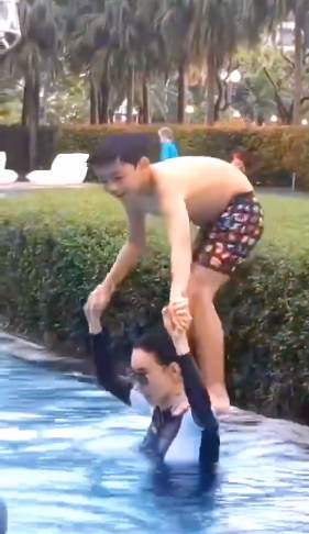4月23日,张柏芝在微博晒出一段视频,并配文称:“太有趣了!”视频中的她身穿泳衣,与儿子在泳池戏水,她还让儿子坐在自己的肩膀上,十分有爱。