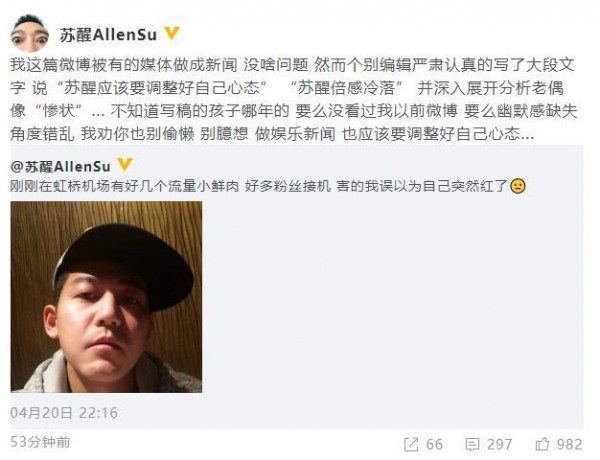 4月20日,苏醒通过微博晒自拍照,并幽默的配文道:“刚刚在虹桥机场有好几个流量小鲜肉,好多粉丝接机,害的我误以为自己突然红了!”照片中,苏醒戴着棒球帽,苦着一张脸。此微博被网友过分解读,称他言语之间有着明显的落寞。