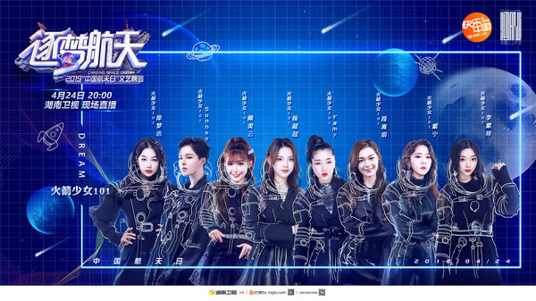 4月24日晚,首档航天题材电视文艺晚会《筑梦航天——2019“中国航天日”文艺晚会》于湖南卫视强势登陆。火箭少女101作为新时代偶像女团,以青春正能量青年的形象活力亮相,热血舞台点燃“航天筑梦”之魂,为424中国航天日倾情助力。