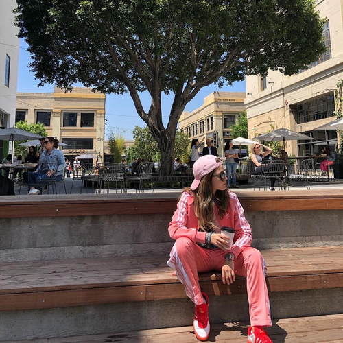 4月26日,昆凌最新街拍曝光,她身穿一身粉色运动服,反戴粉帽子,青春靓丽又甜美时尚。阳光洒在身上,昆凌随意坐在台阶上喝着咖啡眺望远处,悠闲甜笑像足高中生。