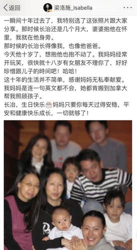 4月26日,梁洛施晒照为她与李泽楷所生的长子李长治庆祝10岁生日。她在配文中感叹时间过得太快,希望儿子平安和健康快乐的长大,此外,她更是首次主动提及李泽楷,谈到儿子小时候长得像爸爸。原文如下:一瞬间十