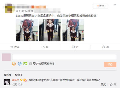 近日,李承铉被拍到带女儿lucky现身机场,随后照片被某博主上传至网络。27日,李承铉本人在评论区给该博主留言:“我都好好的请求你们不要用小朋友的的照片,答应我以后还这样吗?”