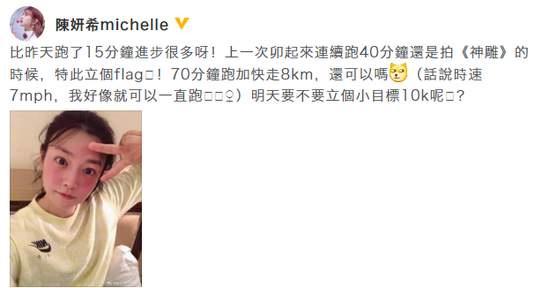 28日,陈妍希在微博晒出长跑后的素颜自拍照,并配文“比昨天跑了15分钟进步很多呀!上一次卯起来连续跑40分钟还是拍《神雕》的时候,特此立个flag!70分钟跑加快走8km,还可以吗?明天要