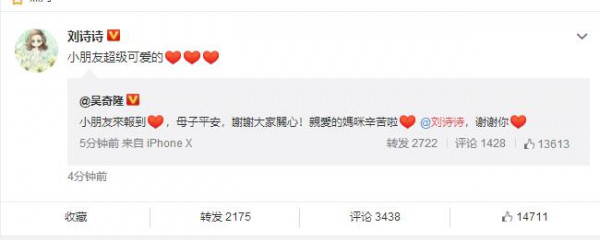 吴奇隆微博发文证实产子喜讯,并配上多个心形表情“小朋友来报到,母子平安,谢谢大家关心!亲爱的妈咪辛苦啦@刘诗诗,谢谢你[心]”。随后刘诗诗转发,可以说非常幸福了,恭喜!
