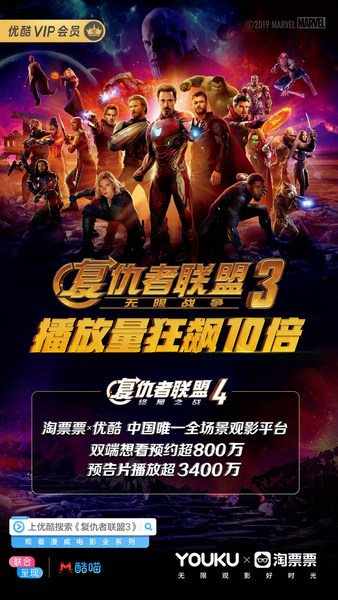 据悉,《复联3》于2018年10月1日至2019年4月1日在优酷首轮上线,并于《复联4》公映后的4月27日再度上线优酷开启二轮播放,当日播放量激增,达到首轮日播放均值的近10倍。