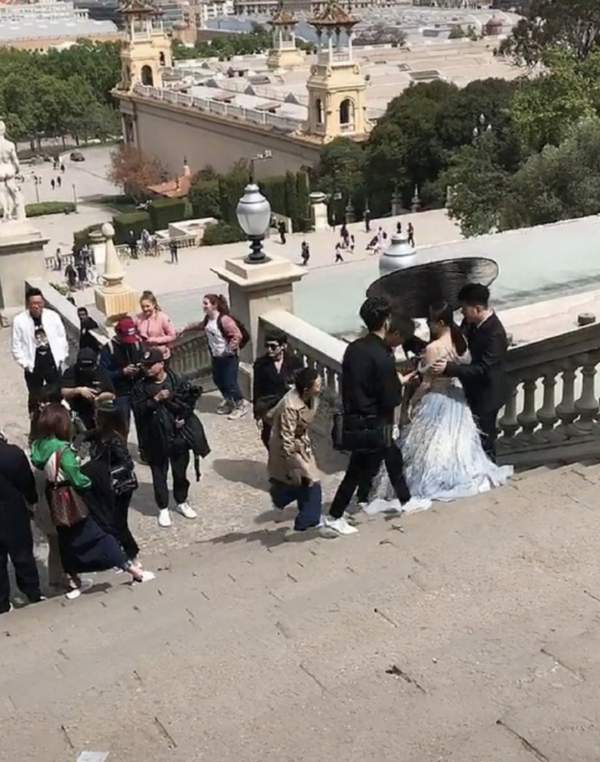 近日,有网友晒出沈梦辰杜海涛现身巴塞罗那街头。沈梦辰身穿婚纱,杜海涛西装革履,二人站在台阶上拍婚纱照,场面十分甜蜜。