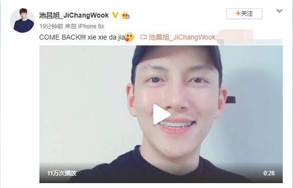 4月29日,韩国艺人池昌旭在退伍后首度发博晒视频感谢粉丝,“COME BACK!!! xie xie da jia”。视频中他素颜出镜,穿着黑色上衣戴着黑色帽子,精神状态十分不