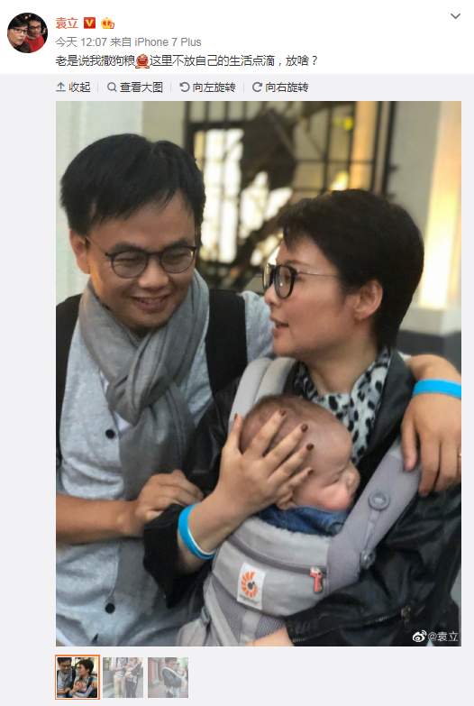 袁立微博截图29日,袁立晒出一组合照,除了她和老公梁太平,怀中还抱有一个可爱的宝宝,并配文,“老是说我撒狗粮,这里不放自己的生活点滴,放啥?”引得网友都忍不住问袁立:&ldqu