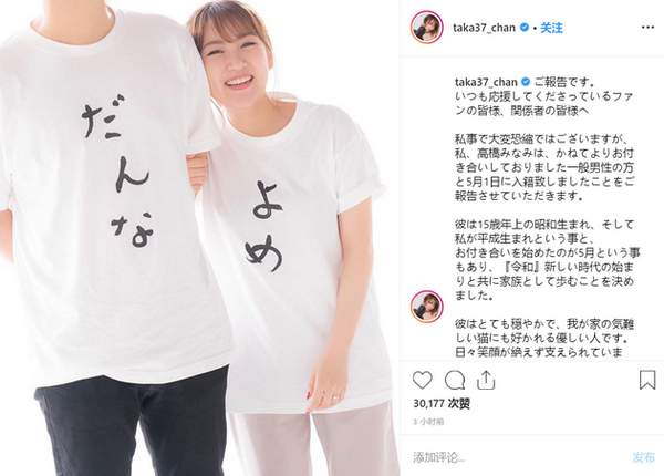 前AKB48总监督高桥南宣布结婚,对方是比她大15岁的男子,从事IT工作。两人于昨天入籍,为“令和元日婚”。高桥南表示男方是昭和时代出生,自己则是平成时代出生,两人在5月开始交往,因此决定在令和时代的第一天正式组建家庭。