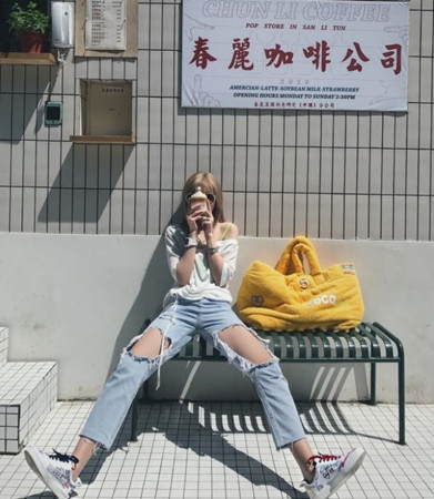 近日,周扬青在社交网晒照,照片中,可以看到周扬青身穿宽松白T,拉下一侧上衣露出内搭的绿色肩带,性感的肩颈线条更是让人难以挪开目光,搭配破裤和球鞋简约又有型,特别引起讨论的是,大腿部份都被大面积剪破。有网友在评论区留言:“这裤子你穿得出去吗?!”周扬青为了证明自己敢穿这条破裤,不但真的穿出门,甚至在路边拍下这张用饮料遮脸的认证照。