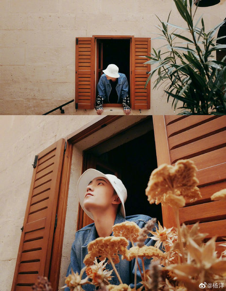5月3日,杨洋在微博晒出一组在印度拍摄的图片。图中的他身穿蓝色牛仔外套,戴着白帽,在木窗边拍下一连串帅照,且身边一定带着花朵,配图贴文“花儿与……应该是少年吧&