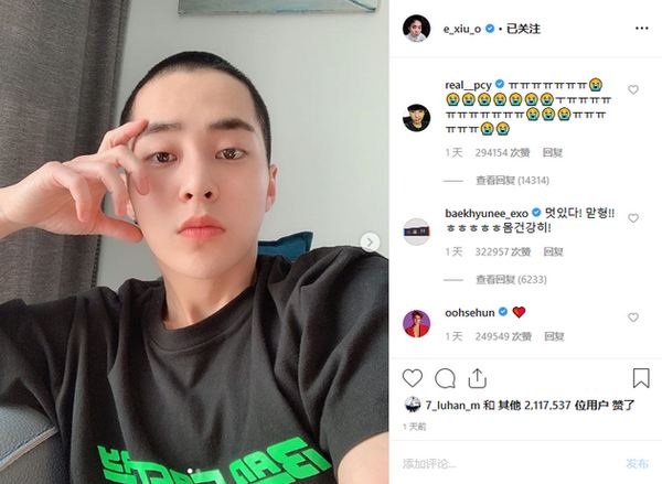 鹿晗罕见点赞EXO金珉锡入伍剃发照