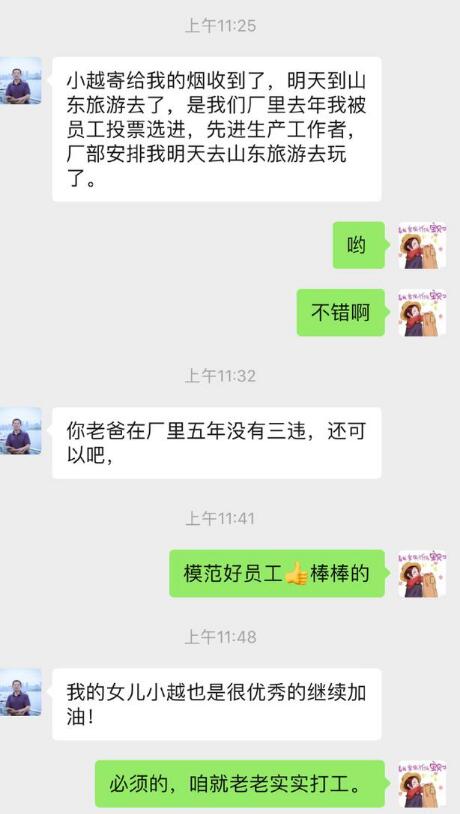 聊天截图中显示,杨超越爸爸获评先进生产工作者要去山东旅游,还骄傲表示自己在厂里五年没有三违,并鼓励女儿也要继续加油。杨超越则回复爸爸称:“必须的,咱就老老实实打工!”父女俩的互动十分积极有爱。
