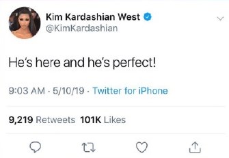 据国外媒体5月10日报道,金-卡戴珊-韦斯特和坎耶-韦斯特的第四个孩子来到这个世界。卡戴珊发文“他在这儿并且很完美!”证实孩子出生。