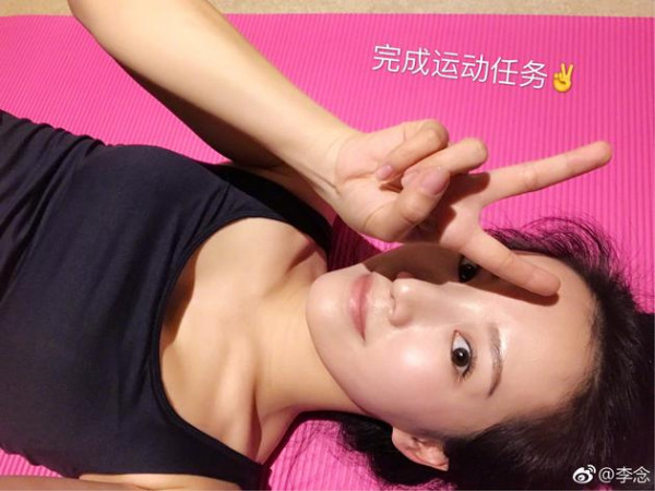 11月29日,李念在微博上晒出一张照片,她身穿黑色吊带背心,躺在瑜伽垫上,对着镜头比V卖萌,她还在照片上配了“完成运动任务”的文字。