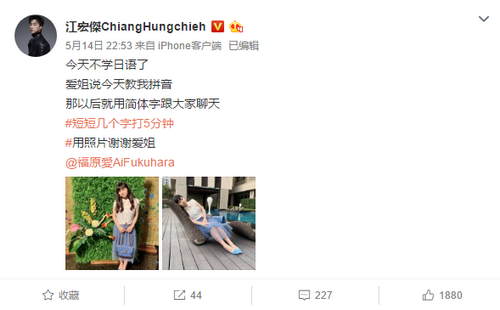 5月14日晚,江宏杰晒出福原爱的优雅美照,并配文称:“今天不学日语了,爱姐说今天教我拼音,那以后就用简体字跟大家聊天。短短几个字打5分钟,用照片谢谢爱姐!”照片中,福原爱披着一