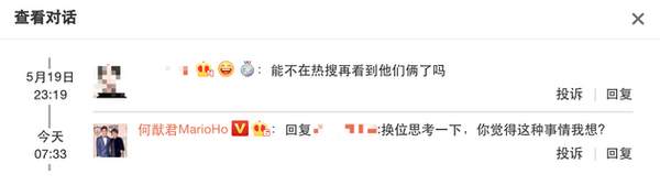 19日晚,有网友在一条有关何猷君为在文物建筑上涂鸦道歉的微博下留言,称:“能不在热搜再看到他们俩了吗?”次日早,何猷君回复了这条评论,并直接表示:“换位思考一下,你觉得这种事情我想?”
