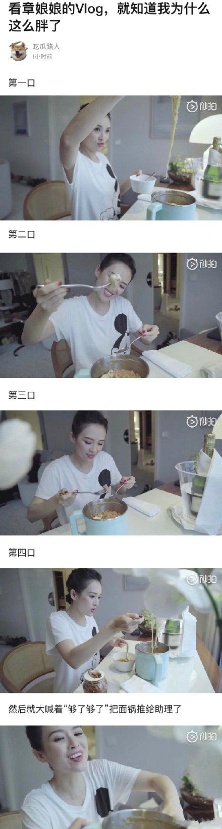 今日章子怡Vlog中曝光了一段她吃泡面的片段。她一锅泡面只吃了四口,就大喊着"够了够了"把面锅推给了助理。
