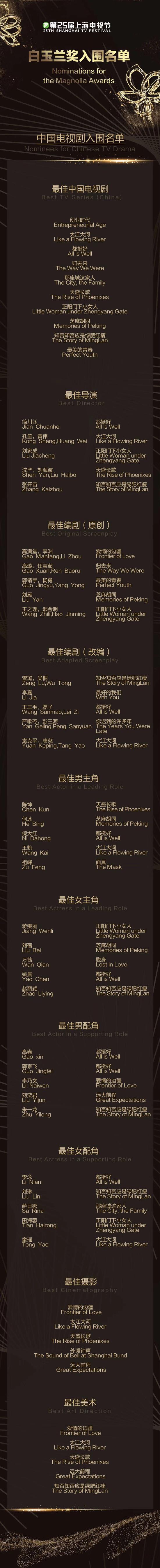 第25届上海电视节白玉兰入围名单公布:陈坤、何冰、倪大红、王凯、祖峰争视帝;蒋雯丽、刘蓓、万茜、姚晨、赵丽颖争视后;《创业时代》、《大江大河》、《都挺好》、《归去来》、《那座城这家人》、《天盛长歌》、《正阳门下小女人》、《芝麻胡同》、《知否知否应是绿肥红瘦》、《最美的青春》入围最佳中国电视剧。