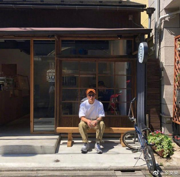 照片中,余文乐坐在街边的长椅子上,白色T恤,土黄色牛仔裤,墨镜棒球帽,随意而帅气。