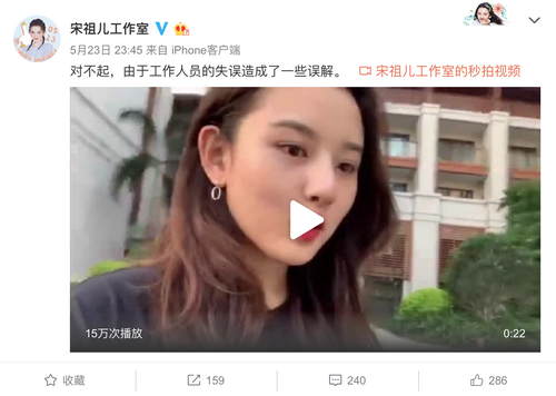 5月23日,宋祖儿晒出vlog,其中有某句话被做了消音处理,引发网友猜测宋祖儿疑似是说了不文明的语句。稍晚,宋祖儿工作室晒出完整视频澄清,表示其实是由于工作人员的失误造成了一些误解。视频中,宋祖儿也并