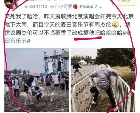 5月26日,有网友通过微博吐槽雨神萧敬腾,称:“笑死我了哈哈,昨天萧敬腾北京演唱会开完今天北京就下大雨,而且今天的麦田音乐节有周杰伦,建议周杰伦可以不唱稻香了改成插秧吧哈哈哈哈……”