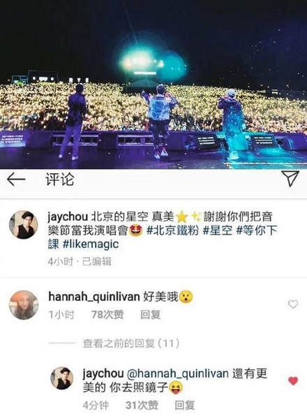 5月26日,周杰伦出席北京麦田音乐节并献唱《等你下课》《稻香》等多首名曲,吸引了大批粉丝到场支持。当晚,周杰伦在社交平台上分享了一张台下粉丝为其应援的照片,照片中粉丝们打开手机的闪光灯,汇成一篇美丽的星海,周杰伦配文称:“北京的星空真美,谢谢你们把音乐节当我演唱会”,昆凌也随后称赞道,“好美哦”。周杰伦随即回复,“还有更美的,你去照镜子。”