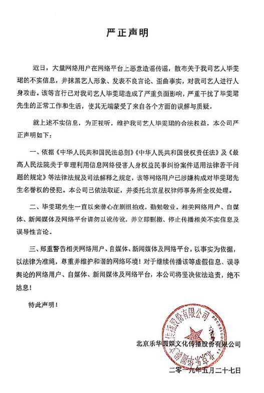 因粉丝骂战持续升级 施展毕雯珺方发声明维护名誉权
