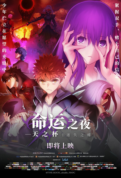 《命运之夜——天之杯II :迷失之蝶》是TYPE-MOON发售的文字冒险游戏《Fate/stay night》中最终路线HF线的动画剧场版中的第二章。该剧场版于2019年在日本上映后3天内便突破了6亿日元的票房。另外,剧场版《命运之夜——天之杯II :迷失之蝶》还分别获得了“PIA电影上映首日满意度调查”、“Filmarks电影上映首日满意度排名”第1名。